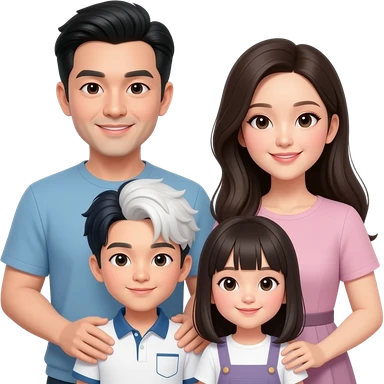 Asian Family of 4 (Dad w/ black & white hair, Mom w/ long hair, Son w/ Kpop hair, Daughter) emoji