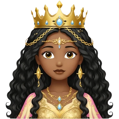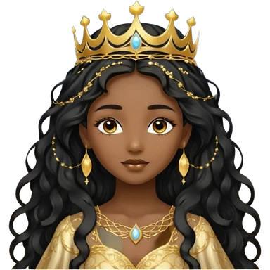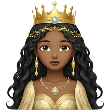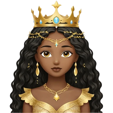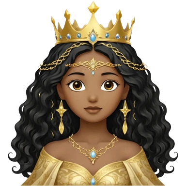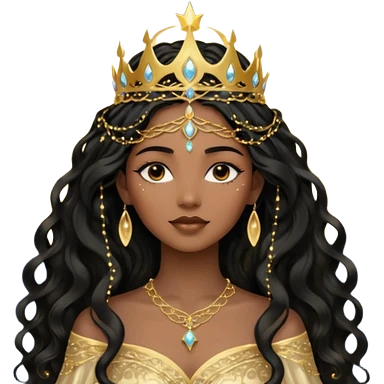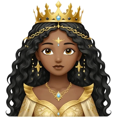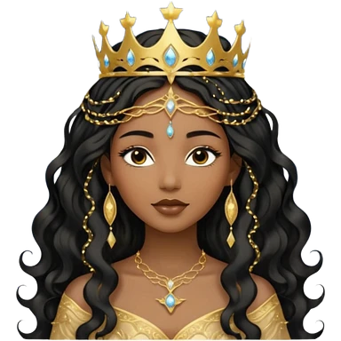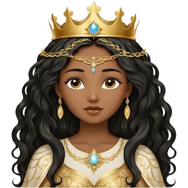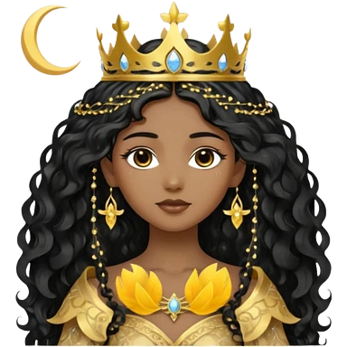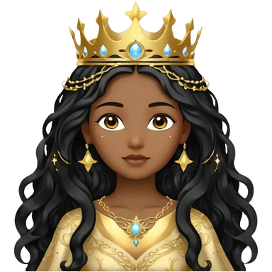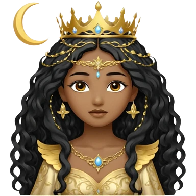 a black beautiful angel with gold pattern on her face and and long wavy black hair, she wears a ethereal crown with sparkling strings and a beautiful sparkling golden gown with moon crest in the middle of the gown, her face calm, gentle and kind, magical aura around her emoji