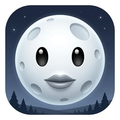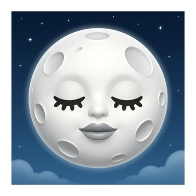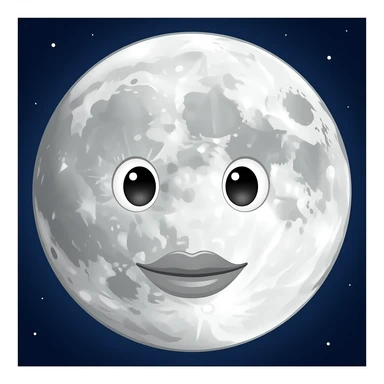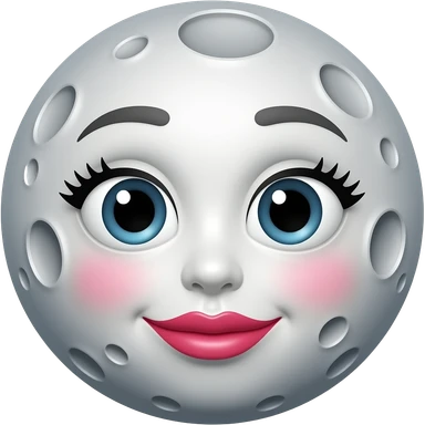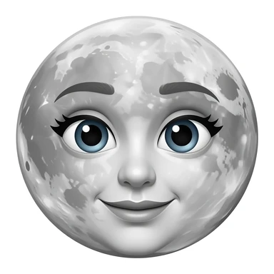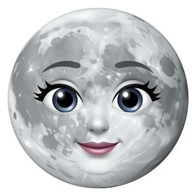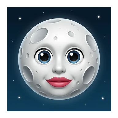 planet Moon with a cartoon kind face with small feminine eyes and round craters for the moon. gray moon colored lips emoji