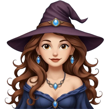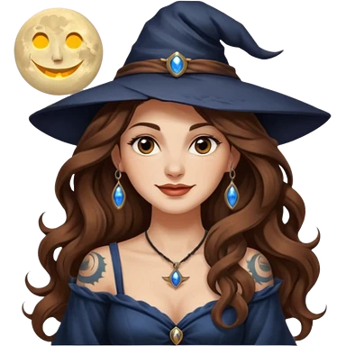 moon witch woman long wavy brown hair tattoos shoulder glance smirk emoji | AI Emoji Generator