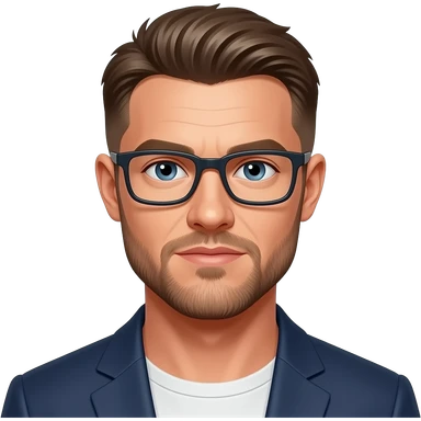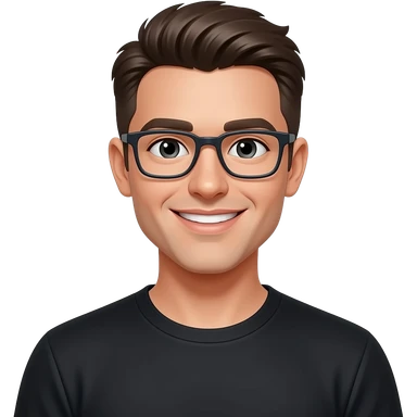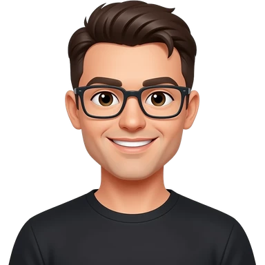 skinny man, with rectangle glasses, white skin, with very modern hairstyle, nice smile, wearing blacktshirt emoji