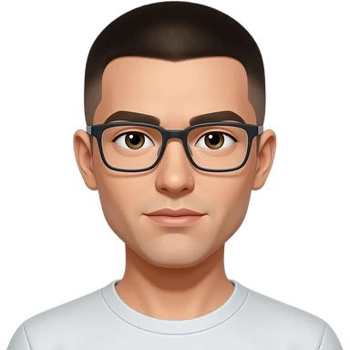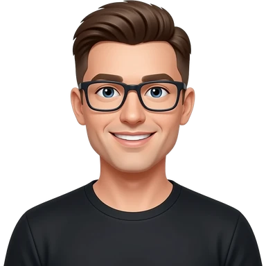 skinny man, with rectangle glasses, white skin, with very modern all top flat short in the sides hairstyle, nice smile, wearing blacktshirt emoji