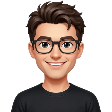 skinny man, with rectangle glasses, white skin, with very modern top messy hairstyle, nice smile, wearing blacktshirt emoji