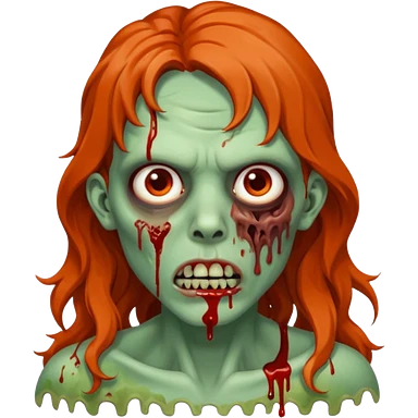 Faça com aparência de zumbi, sagrando na boca, cabelo ondulado no ombro marrom meio alaranjado nas pontas emoji