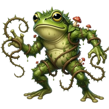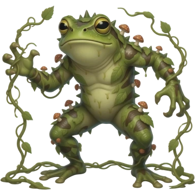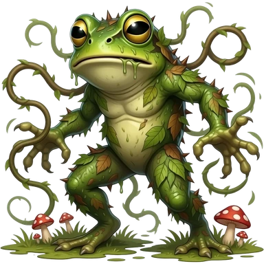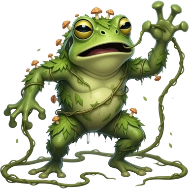 Mosskip A frog-like plant creature with spiky vine markings and damp green skin. it is dry, and is covered in leaves and mushrooms. attacks with whipping vines emoji