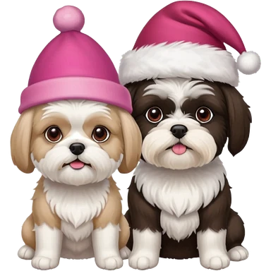two dogs one little white all over shih tzu dog with pink santa hat and one mostly white with black havanese dog wearing a red santa hat emoji