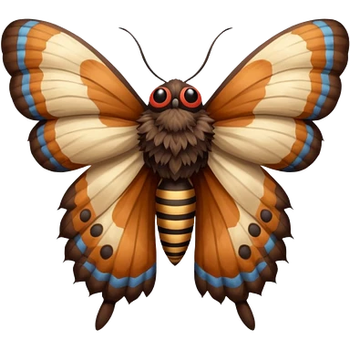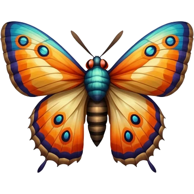 moth with blue eyes mornach butterfly wings orange and yellow with red godzilla eyes on the wings, brown tail, black Moth Insect Arms and legs almost like mothra emoji