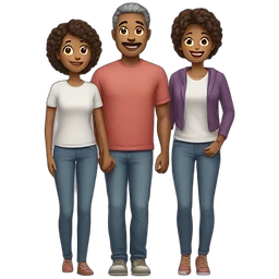 A happy family of four - father in white t-shirt and cap, mother with red hair in coral dress, young daughter in matching dress with rainbow handbag, teenage son in light embroidered shirt, all smiling together emoji