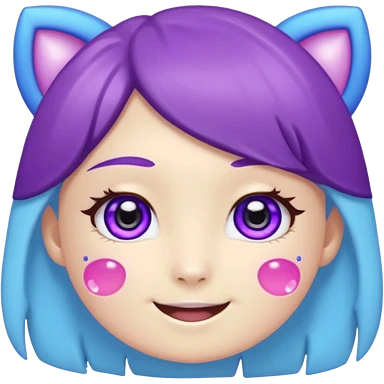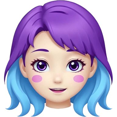 de color azul claro brillante con manchas orgánicas en tonos morado y violeta.El rostro es expresivo y kawaii, con ojos grandes y brillantes, cejas pequeñas y una sonrisa abierta con lengua rosada. Estilo moderno, limpio y tierno, ideal como emoji, sticker o mascota digital. emoji