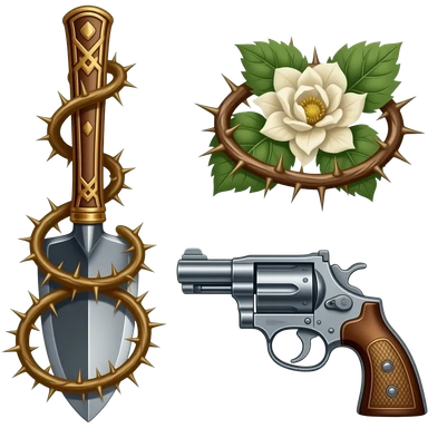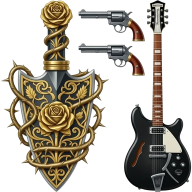 richly ornamented spade surrounded by tendrils of thorns and antique 1851 Navy Revolvers and Rickenbacker Motorhead MODEL 4003SW emoji