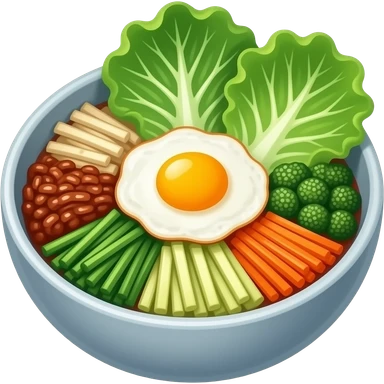 spring themed korean bibimbap, fresh green cabbage leaves, vibrant vegetables, fried egg, bright natural light, soft shadows, fresh and healthy mood emoji