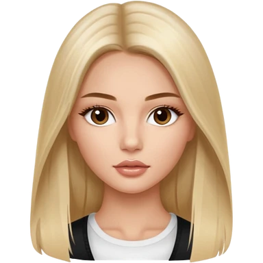 victoria’s secret model with long light blonde straight balayage hair, small dark brown almond eyes, oval face, small lips emoji