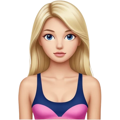 Victoria’s Secret model with long light blonde straight balayage hair, dark blue almond and small eyes, oval face, small lips, skinny long waist, firm legs, pink crop top emoji