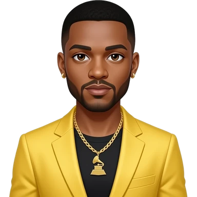 Usher with brown eyes, black buzz cut hair, butter yellow grammy suit jacket, necklace and earrings emoji
