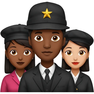 Black man with fitted hat on with two women one black one Chinese emoji