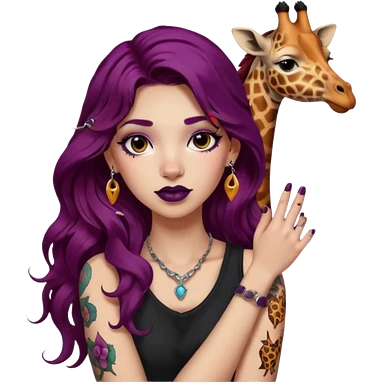 girl with long wavy plum color hair, giraffe tattoo on arm, dark lipstick, piercings emoji