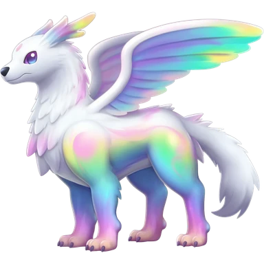 Colorful iridescent whitish pastelish luminescent angelic divine shiny sparkly glittery Gryphon-Trico-Sergal-Furret-Ferret-Wolverine-Vernid-fusion-Fakemon-animal-hybrid-creature, full body emoji