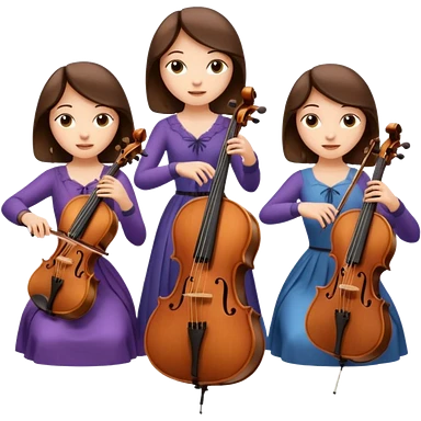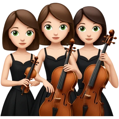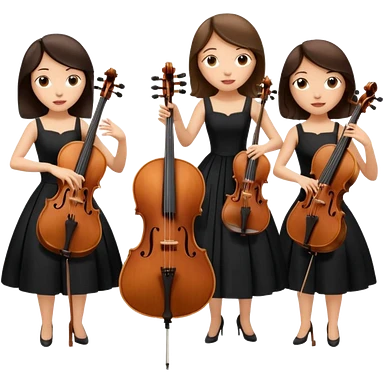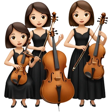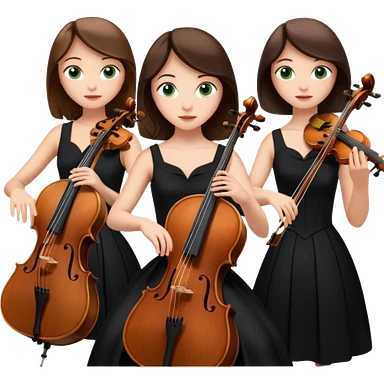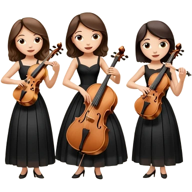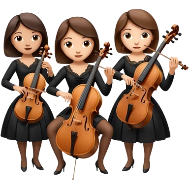 Create an imagine of three brunette women playing string instruments in black dresses, the first is playing a cello, the second is playing a viola and the third is playing the violin emoji