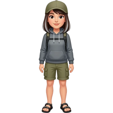 Woman in Birkenstocks, no socks, cargo capri shorts, hoodie, dark brown hair with silver streaks, flat trail emoji