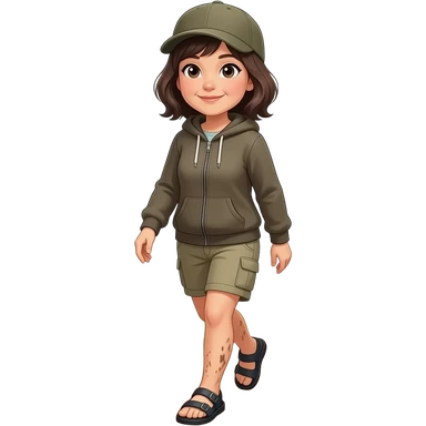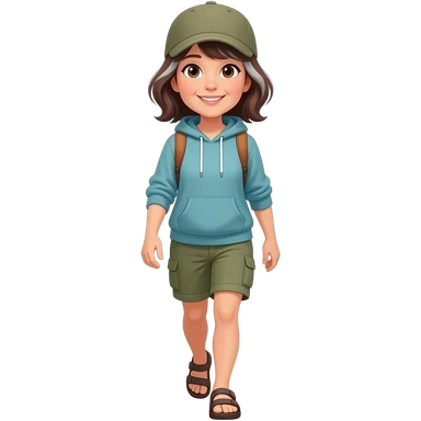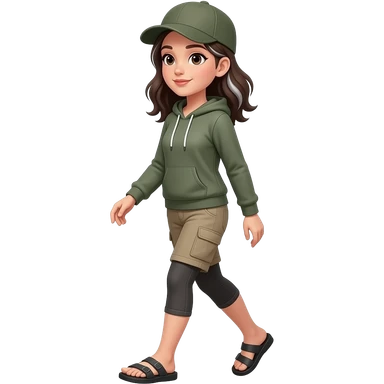 Woman in Birkenstocks, no socks, cargo capri shorts, hoodie, dark brown hair with silver streaks, flat trail, walking emoji