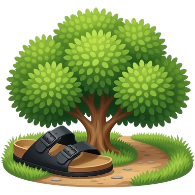 Black Birkenstocks peaking out from under the branches of a lush green bush situated by a hiking trail emoji