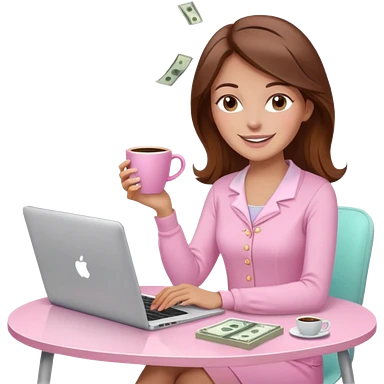 woman character with laptop and coffee relax table, dollars are floating, colorful pastel pink outfit, white laptop, brownn hair, fair skin, emoji