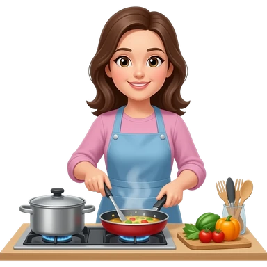 mujer de cabello oscuro y corto, con ojos color cafe, con vestido color rosa, haciendo el almuerzo una ensalada de vegetales emoji