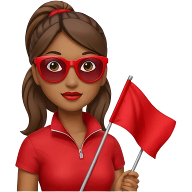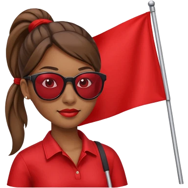 Una mujer morena con una coleta y gafas de sol y una bandera roja en la mano emoji