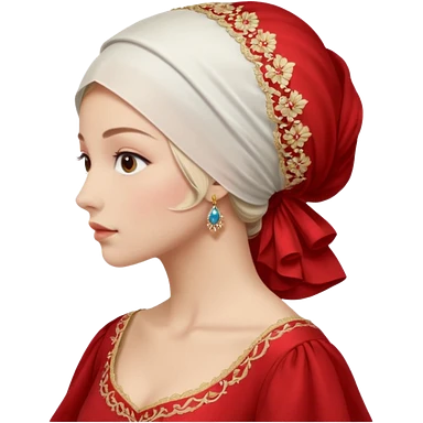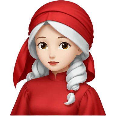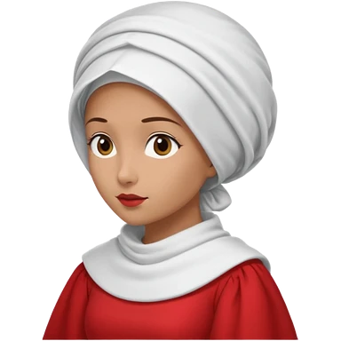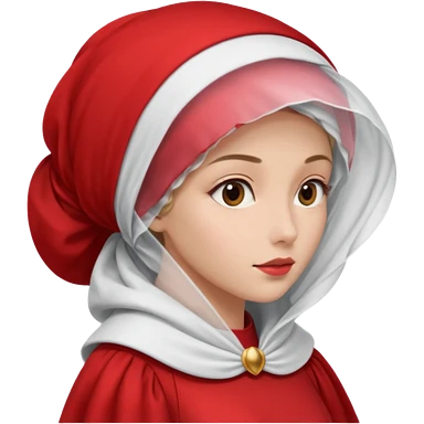 mujer de perfil con un vestido rojo de manga y falsas largas y voluptosas, y una toca blanca GRANDE que no se le ve la cara porque la toca la cubre emoji | AI Emoji Generator