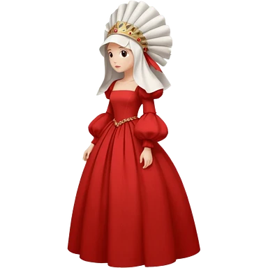 mujer de perfil con un vestido rojo de manga y falsas largas y voluptosas, y una toca blanca GRANDE que no se le ve la cara porque la toca la cubreemoji