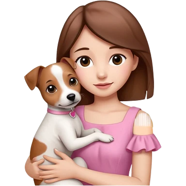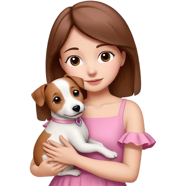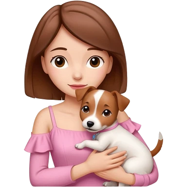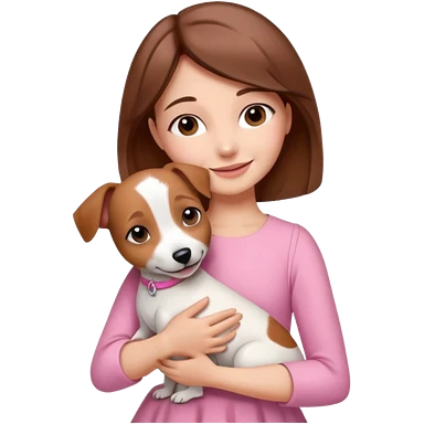 Joven mujer pelo marron vestida de rosado abrazando a su perro color beige crema que es un estilo de jack russel emoji