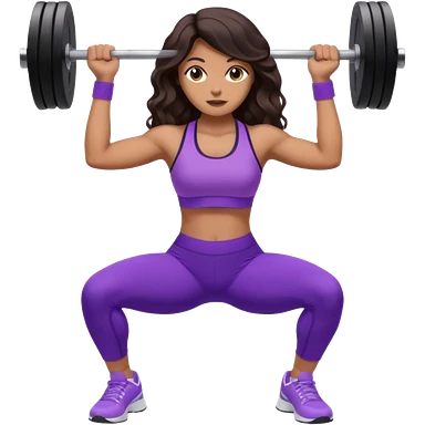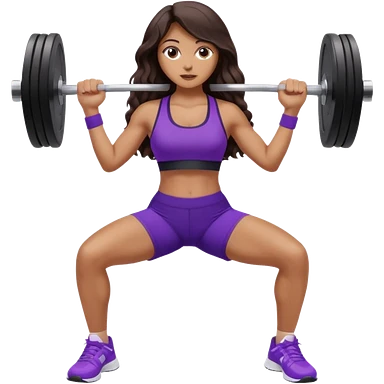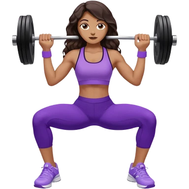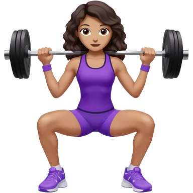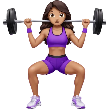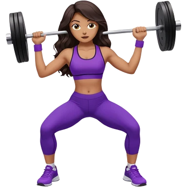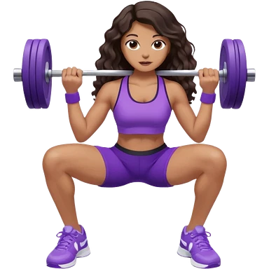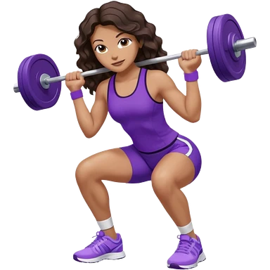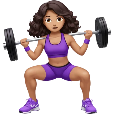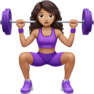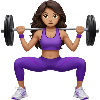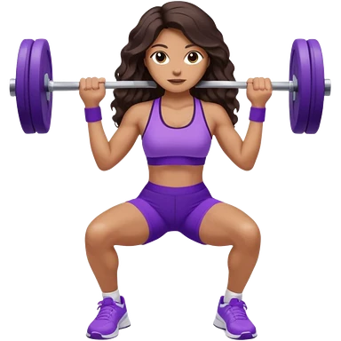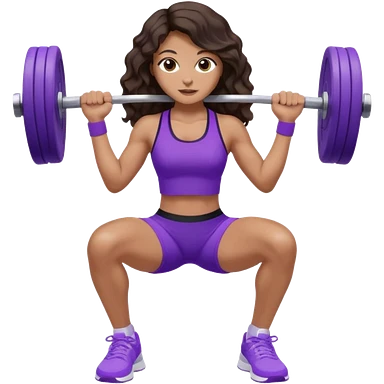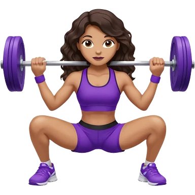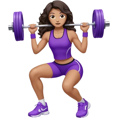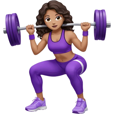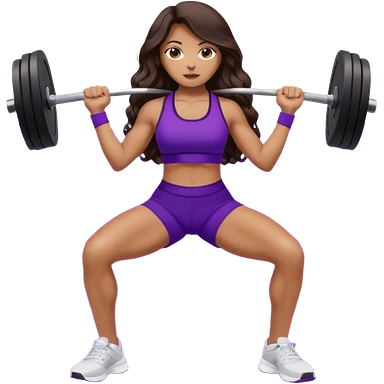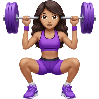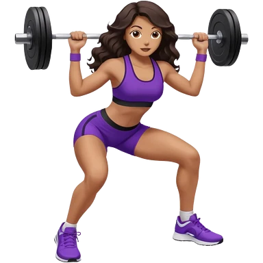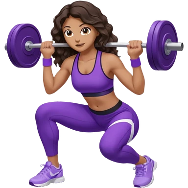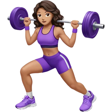 mujer de tez trigueña, con cabello castaño oscuro ondulado no muy marcado, hasta la cadera super largo estilizado, con ropa deportiva morada/lila, tenis blancos deportivos y levantando una pesa emoji