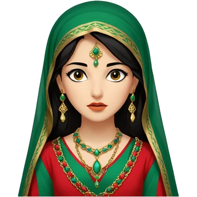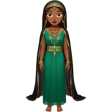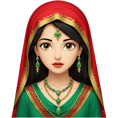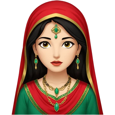 Ropa de inspiración árabe: túnica colorida (rojo, dorado, verde esmeralda), con detalles dorados o lentejuelas; brazaletes y pendientes.emoji
