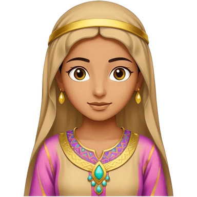 Negro, largo y brillante, suele ir cubierto parcialmente por un velo o pañuelo oriental.inspiración árabe: túnica colorida , con detalles dorados o lentejuelas; brazaletes y pendientes.cuerpo entero emoji | AI Emoji Generator