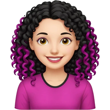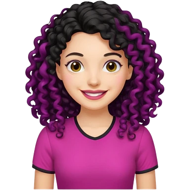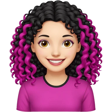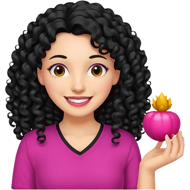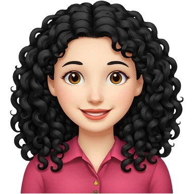 mujer blanca con cabello largo rizado negro sonriendo y con camisa fucsia emoji