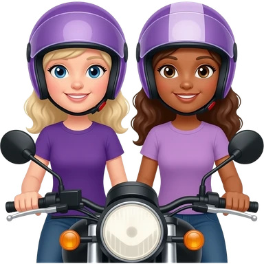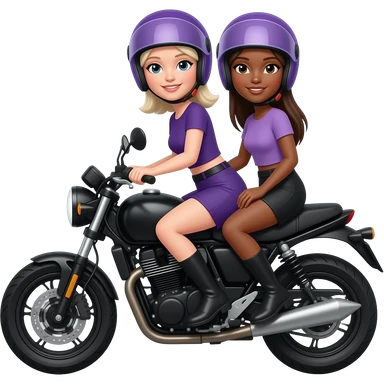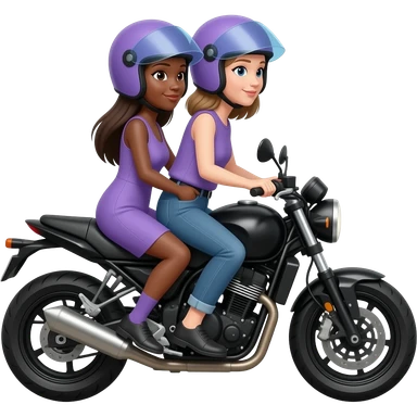 Dos mujeres morena y blanca de cabello lacio en moto negra y con Casco de moto color lila azul emoji