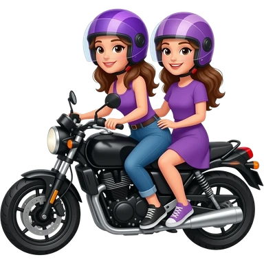 Dos mujeres blanca y morena de cabellos lacios en moto negra y cascos morado y lila emoji