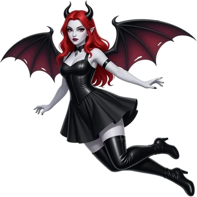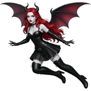 vampiro femmina con pelle bianca e capelli lunghi e rossi con un vestito stretto in vita e largo sotto corto nero e anfibi neri che arrivano alle ginocchia che vola senza ali o corna emoji