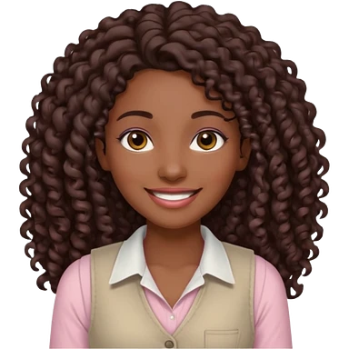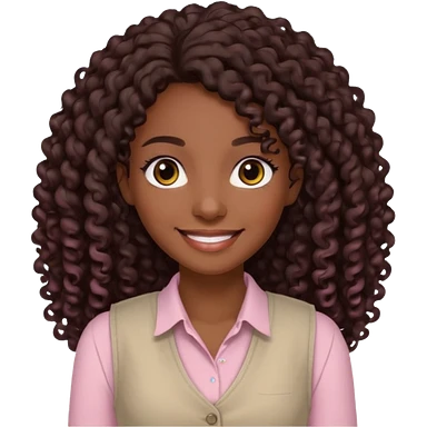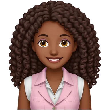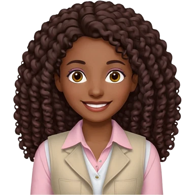 mujer morena, pelo rizado largo, sonriendo, con ojos grandes y marrones con camisa rosa palo y un chaleco blanco emoji