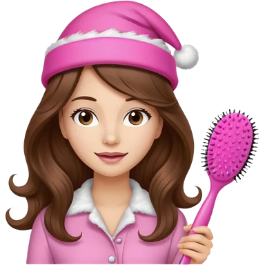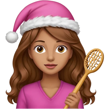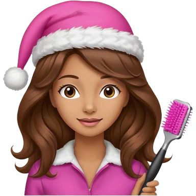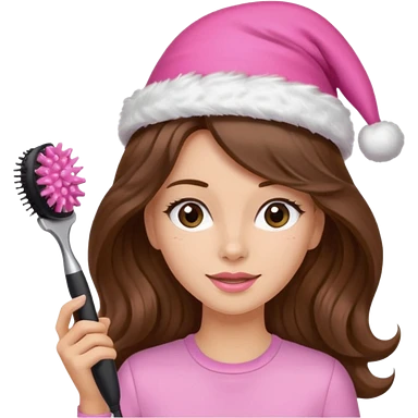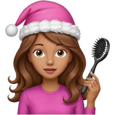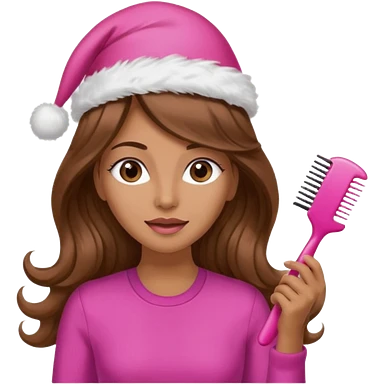 mujer peinandose en la peluqueria y con un gorro de navidad rosado, cabello largo café y ondulado emoji