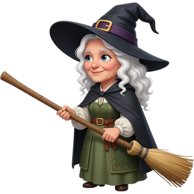 Pelo rizado blanco Bruja de 50 años vestuario antiguo muy natural no estreotipada ni elegante de perfil en escoba mujer emoji