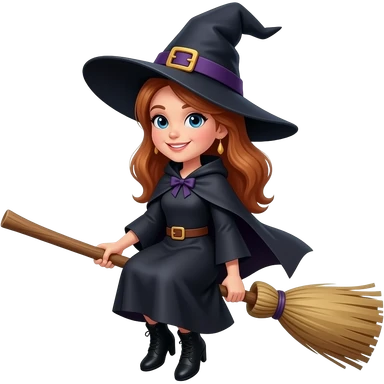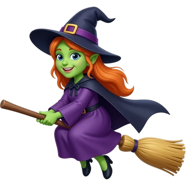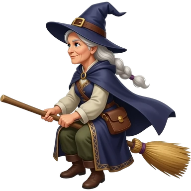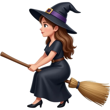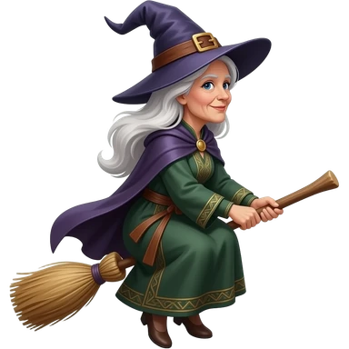 Bruja de 50 años vestuario antiguo muy natural no estreotipada ni elegante de perfil en escoba mujer emoji