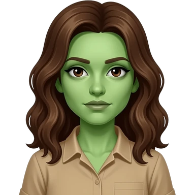 mulher zumbi camisa bege, pele esverdeada, cabelo ondulado castanho e olhos escuros emoji