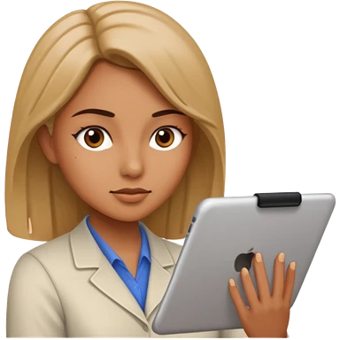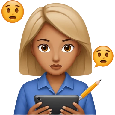 Uma mulher de olhos cor de meu morena e com iPhone 11 na mão trabalhando de social media emoji