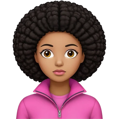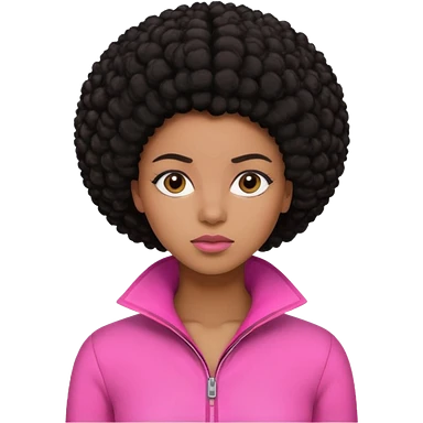 Mulher negra, mostrada do ombro pra cima usando uma roupa rosa claro com cabelo cacheado e volumoso emoji