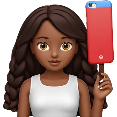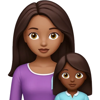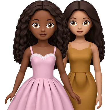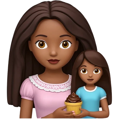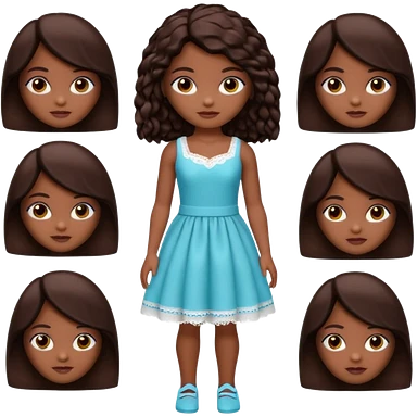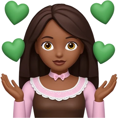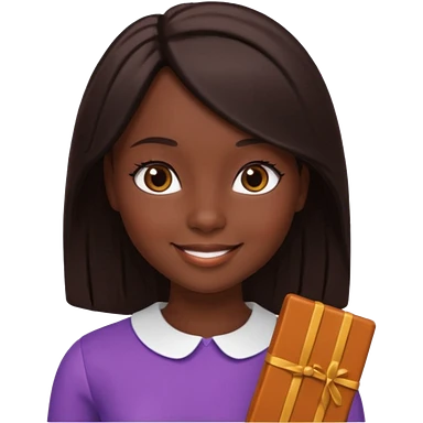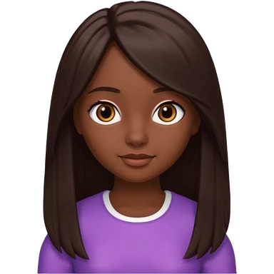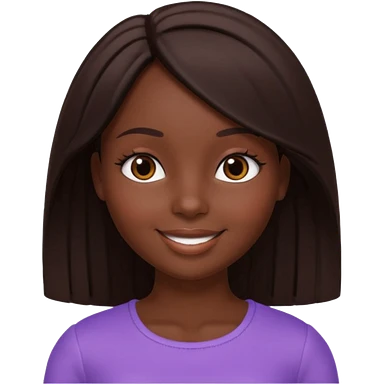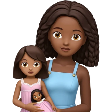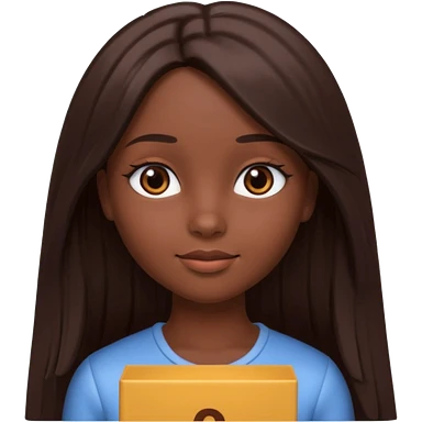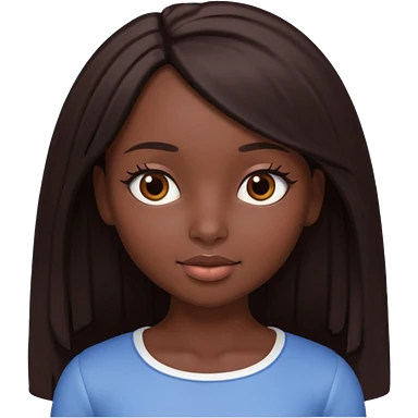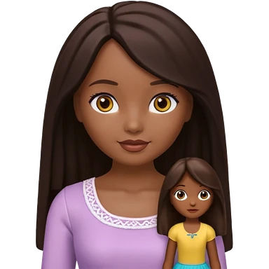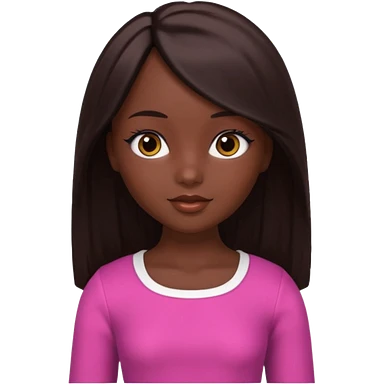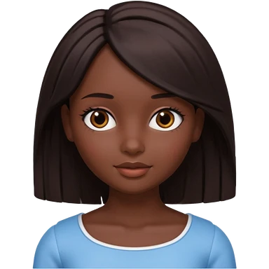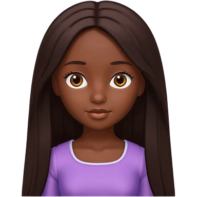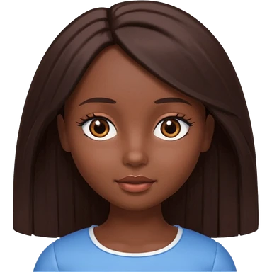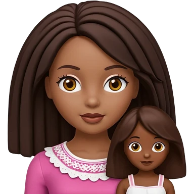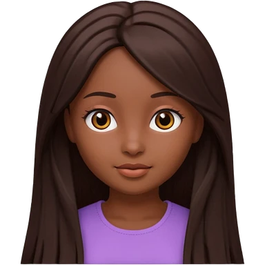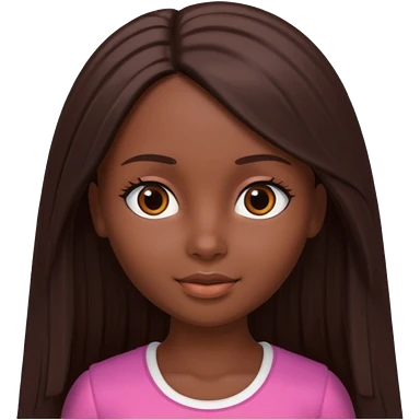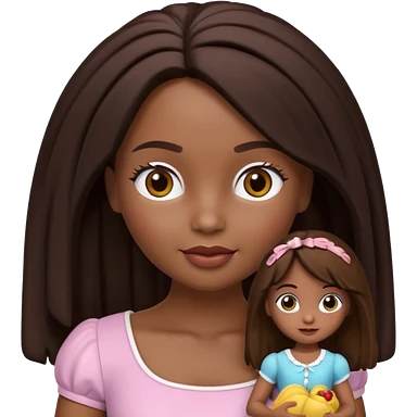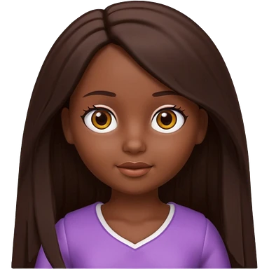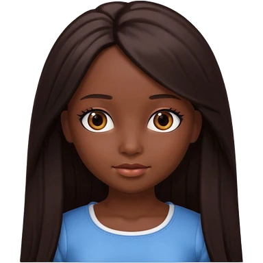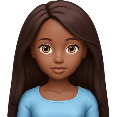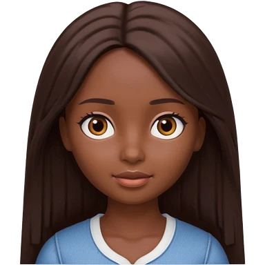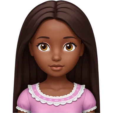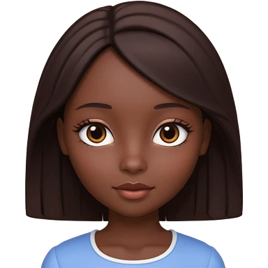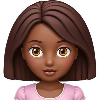 Boneca digital em estilo 3D realista e fofo, semelhante a uma boneca colecionável. Mulher jovem com pele negra, olhos castanhos escuros, cabelo liso cor chocolate, longo e bem alinhado. emoji