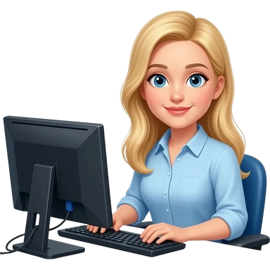 mulher loira no escritório sentada mexendo no computador emoji