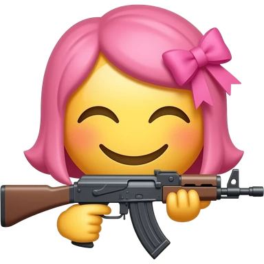 Una cara bonita sonriendo , sin los ojos abiertos sino cerrados pero de emojis hecha como iPhone, aguantando una metralleta y en la metralleta hay un lazo rosa , pero de los que se ponen en el pelo , este pero en rosa 🎀 Que todo quede muy bonito emoji