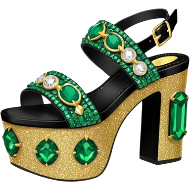 realistic ultra detailed black platform sandals with emerald green and gold sparkly rhinestone emoji