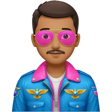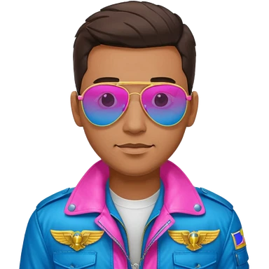 1980s cool man with stubble wearing reflective neon pink and blue aviator sunglasses and a pilot topgun jacket emoji
